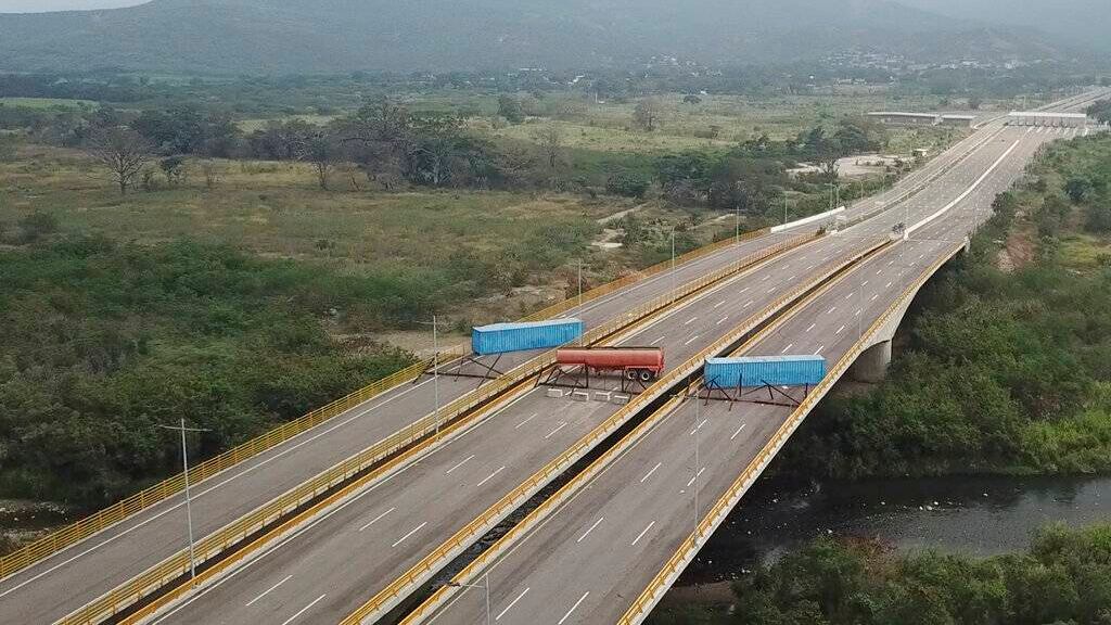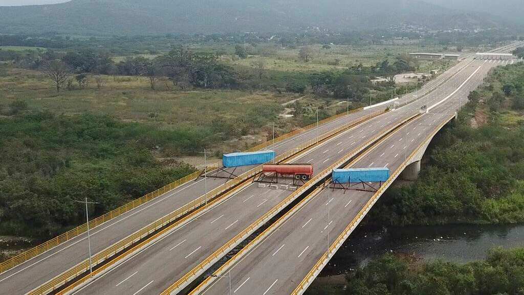 Sobre el puente Las Tienditas -que une la ciudad colombiana de Cúcuta y el poblado de Ureña, en el extremo occidental de Venezuela- se podía ver una reja improvisada hecha con malla para construcción y vigas de metal, una cisterna de combustible de color naranja y dos contenedores de carga color azul.
