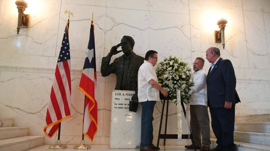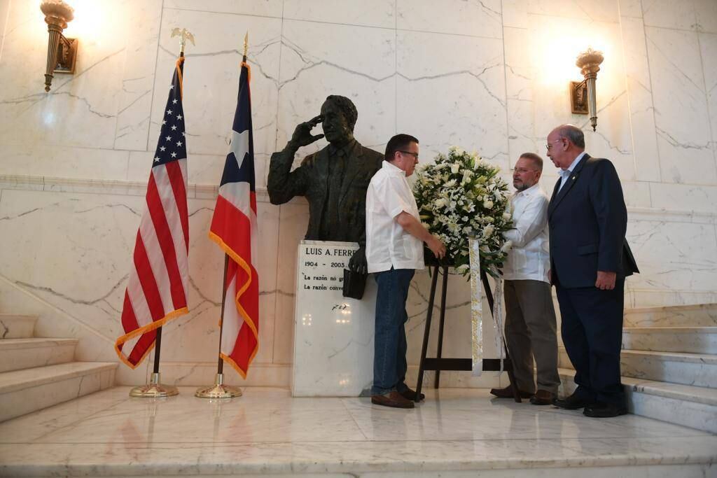 El expresidente de la Cámara de Representantes José Aponte Hernández, junto al representante Ángel Bulerín Ramos y el expresidente del Senado Kenneth McClintock, entregaron hoy una ofrenda floral ante el busto de Don Luis A. Ferré Aguayo para conmemorar su natalicio.