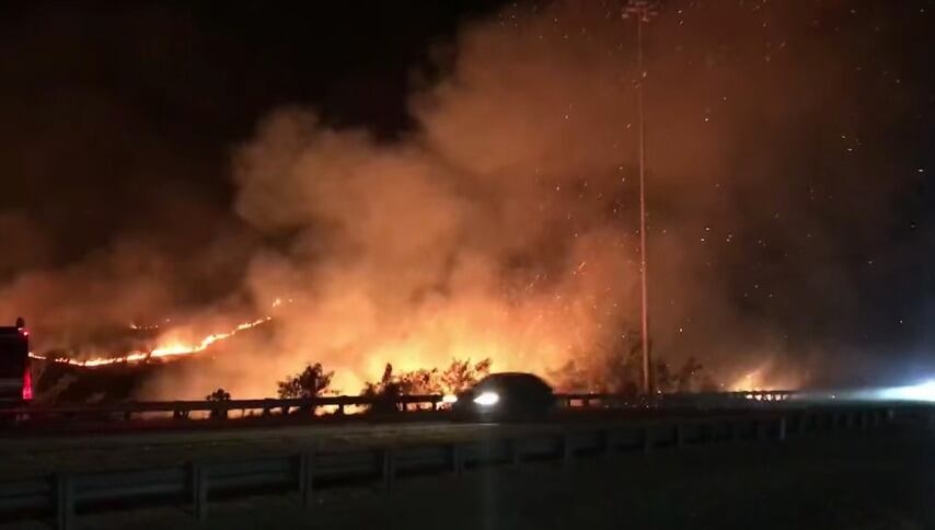 En el video en directo se observa a una enorme llama de fuego consumiendo un pastizal cercano al expreso, mientras vehículos conducen por la zona.