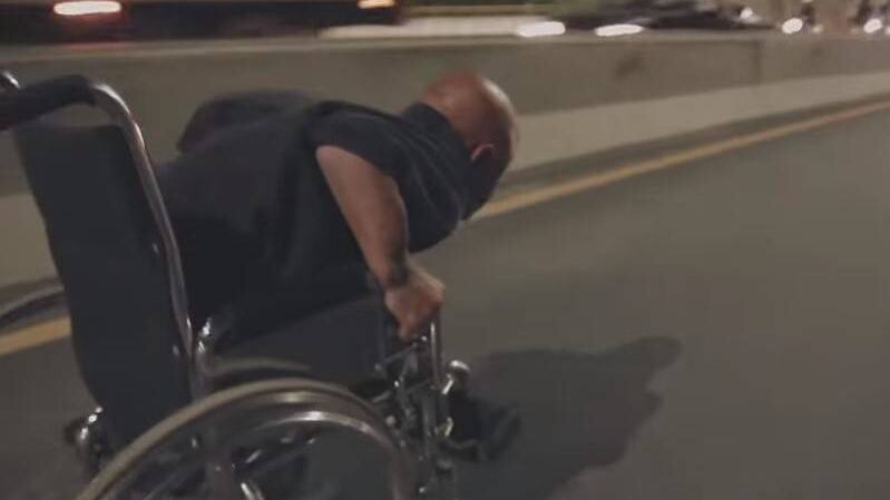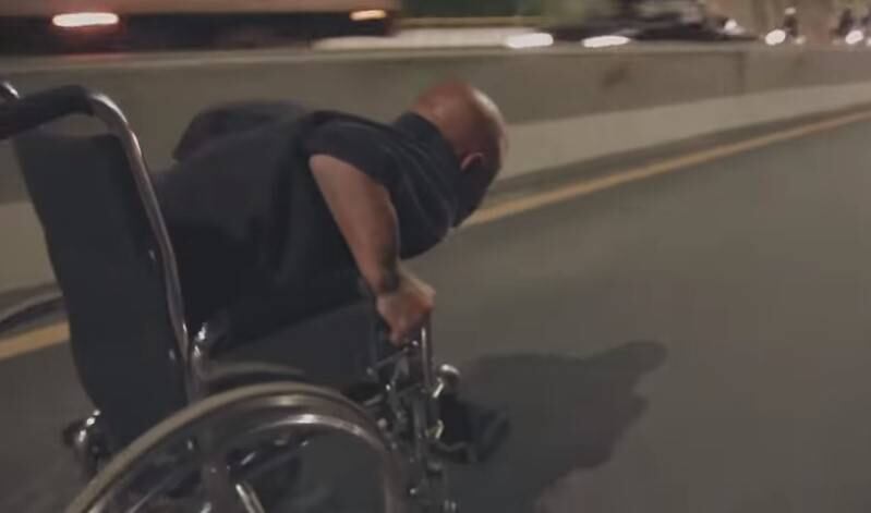 Aparentemente, el joven baja impulsado por su vehículo acompañante, y luego se suelta. En la imagen se ve, incluso, cómo se detiene: pone a ladear su silla de ruedas para perder impulso, y la frena con sus manos. También obliga a detenerse a varios vehículos que seguían, atónitos, al arriesgado.