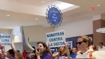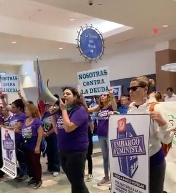 La Colectiva Feminista en Construcción irrumpió hoy en una reconocida sucursal de banco del centro comercial Plaza Las Américas para manifestarse en contra de las instituciones bancarias.