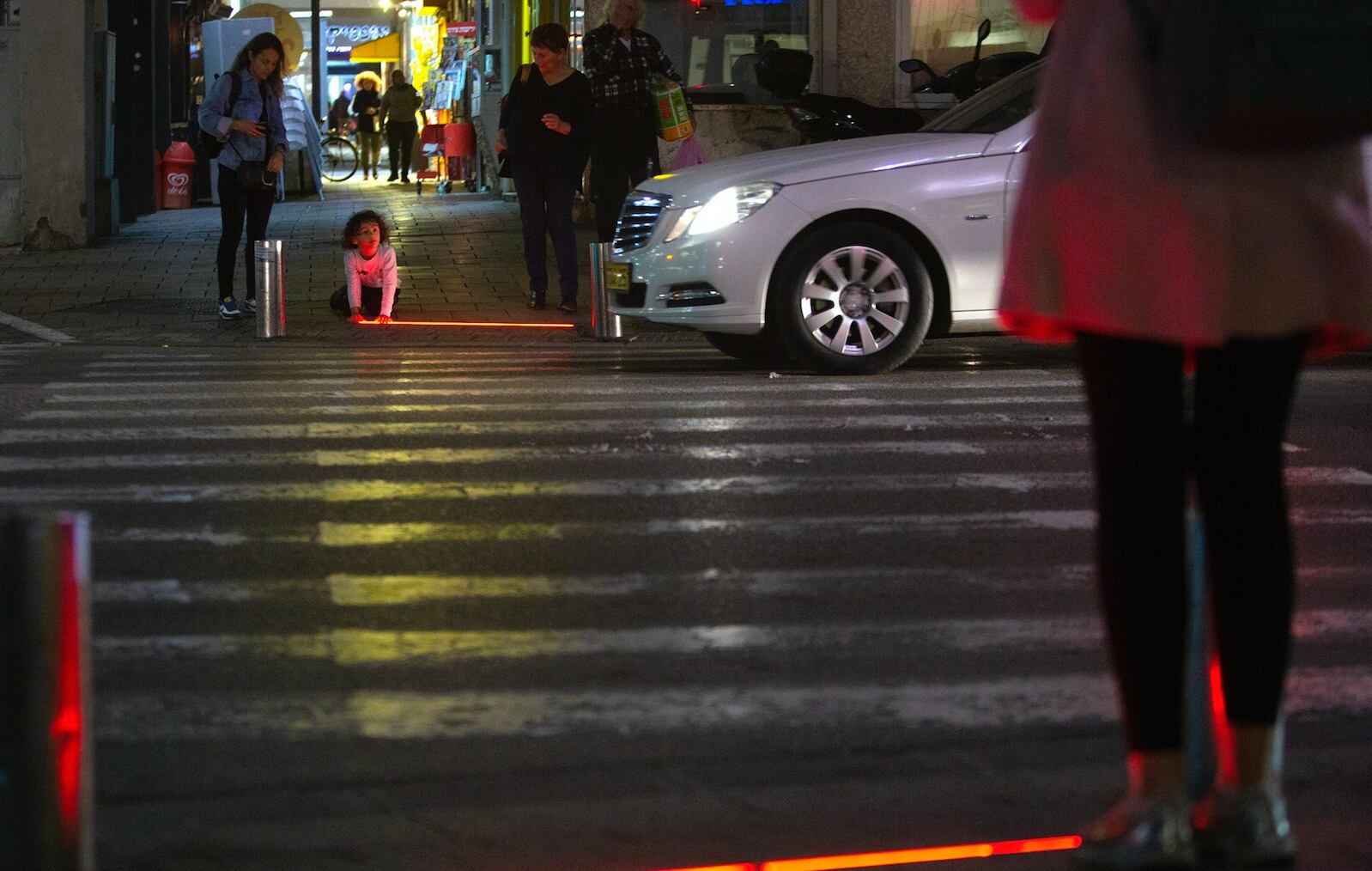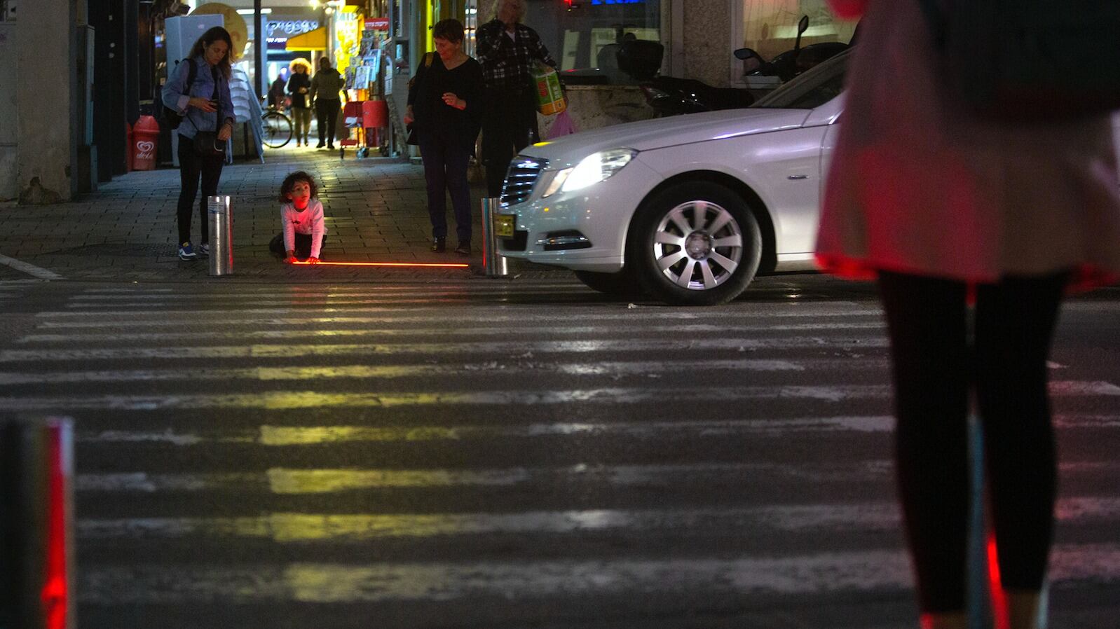 La municipalidad ha instalado luces led en las aceras de un cruce transitado para avisar a los peatones distraídos cuándo pueden cruzar y cuándo deben detenerse.