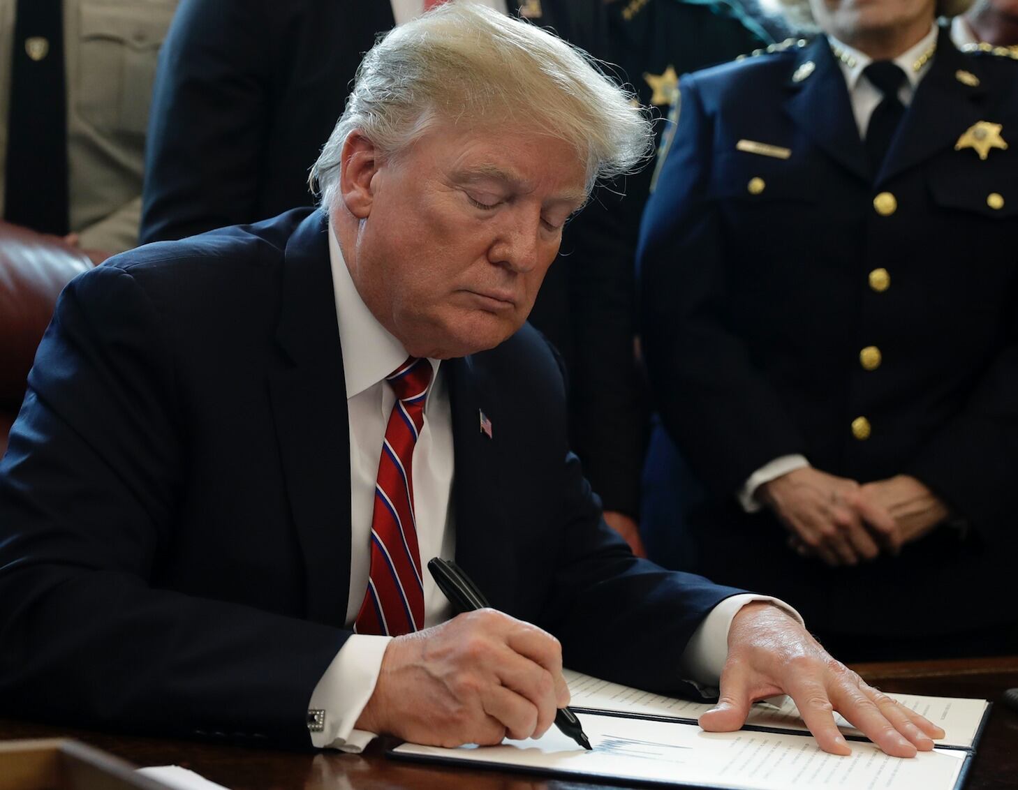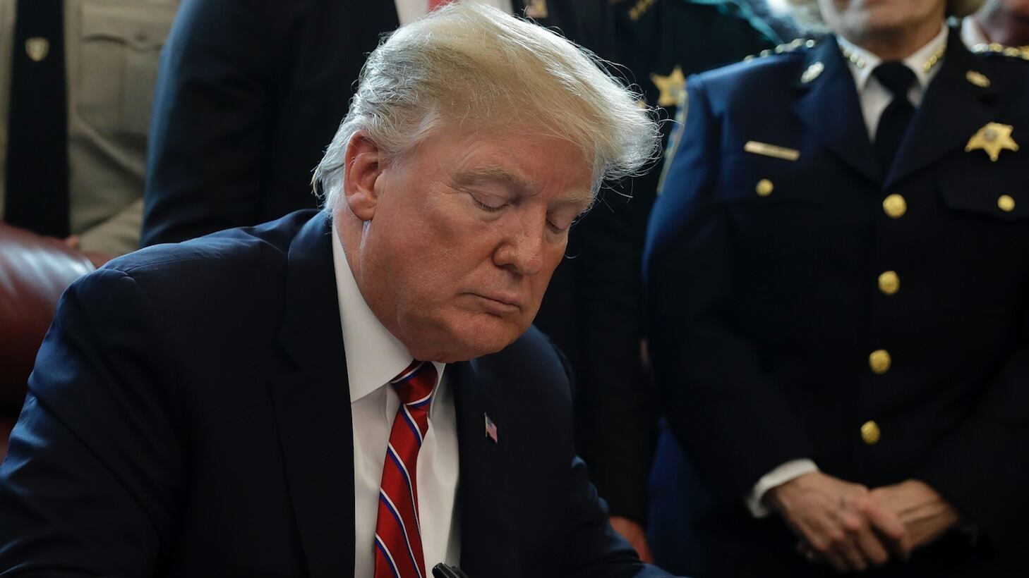 Flanqueado por policías, así como por padres cuyos hijos fueron víctimas mortales de personas que se encontraban sin permiso en el país, Trump sostuvo que no ha dejado de pelear por su principal compromiso de campaña, que continúa incumplido cuando faltan 18 meses para que los electores decidan si le conceden la reelección.