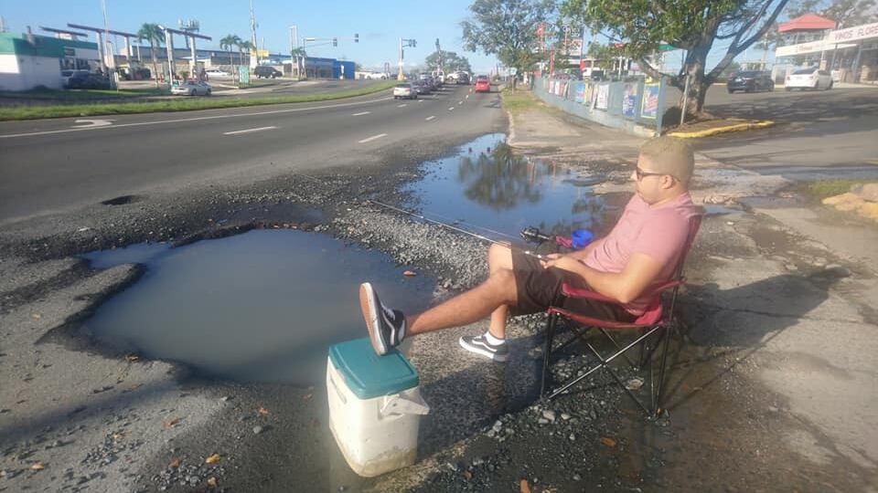 Tratando de sacarle el lado positivo al dolor de cabeza que crean los hoyos de las carreteras todos los días, un ciudadano aprovechó el sol del sábado para irse a pescar en una charca de la zona metro.