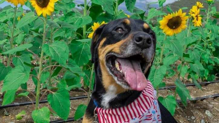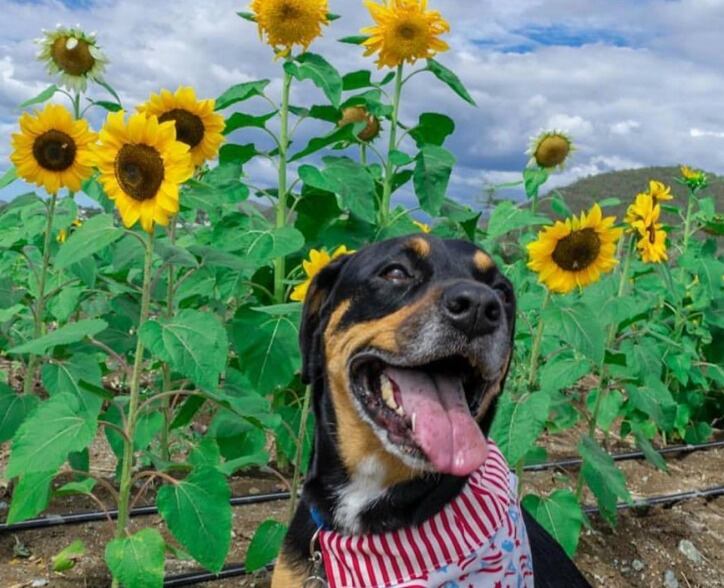 Si desea también puede llevar a su mascota para fotos con los bellos girasoles.