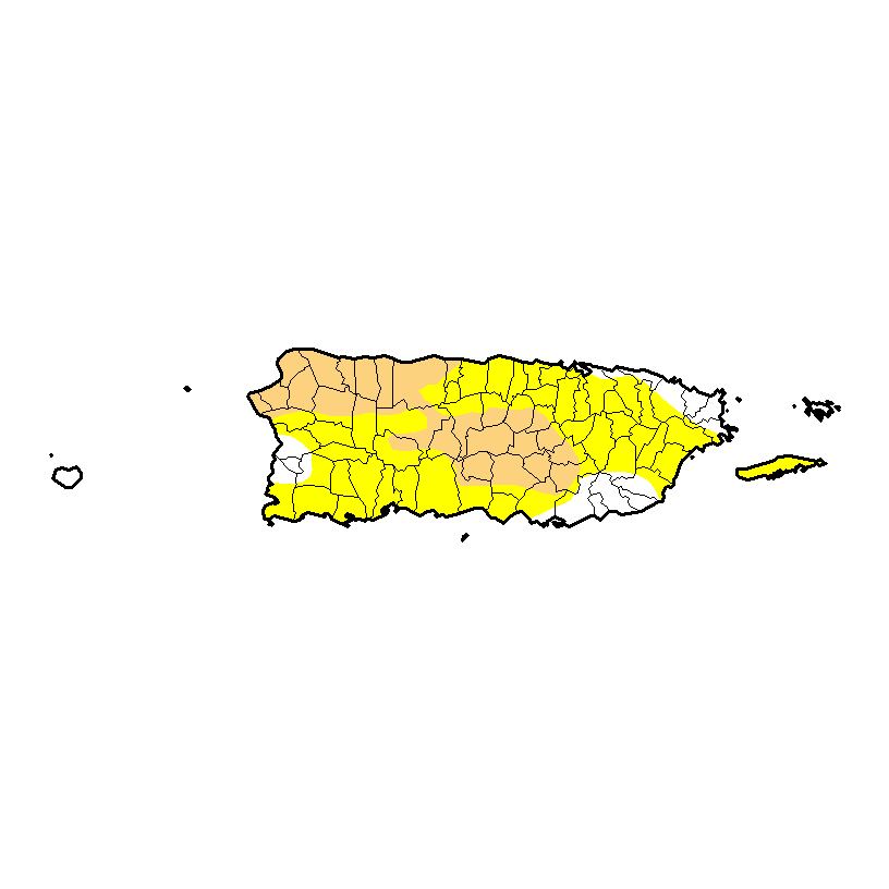 Los pueblos de Adjuntas, Jayuya, Ciales, Morovis, Corozal, Naranjito, Comerío, Cidra, Cayey, Salinas, Aibonito, Barranquitas, Orocovis, Villalba, Coamo, Ponce y Juana Díaz, también se mantienen bajo ese nivel.