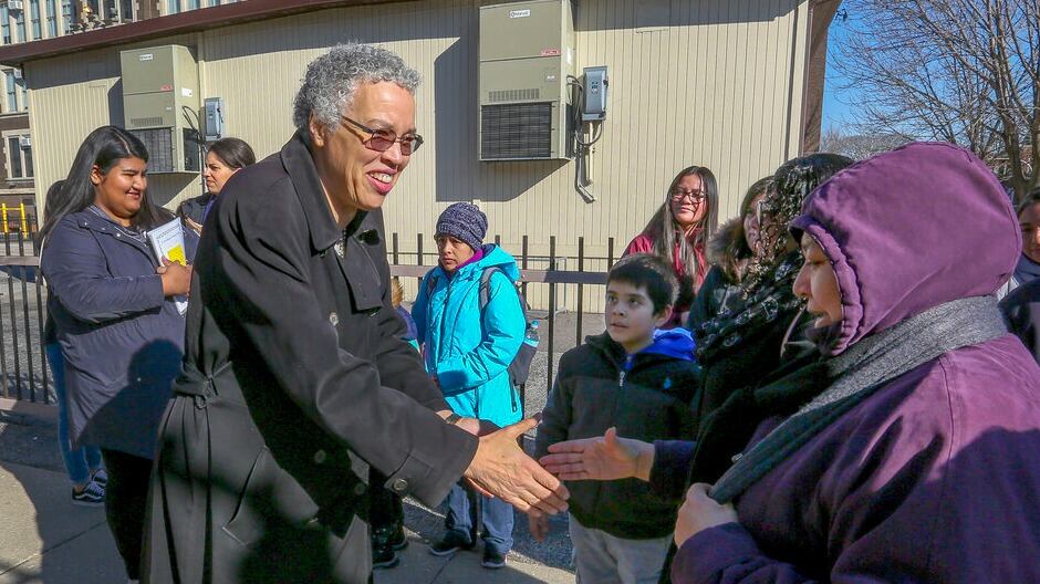 La otra candidata es Toni Preckwinkle, antes maestra de escuela que fue miembro del concejo municipal de Chicago por 19 años antes de ser presidenta de la junta del condado Cook en el 2011.