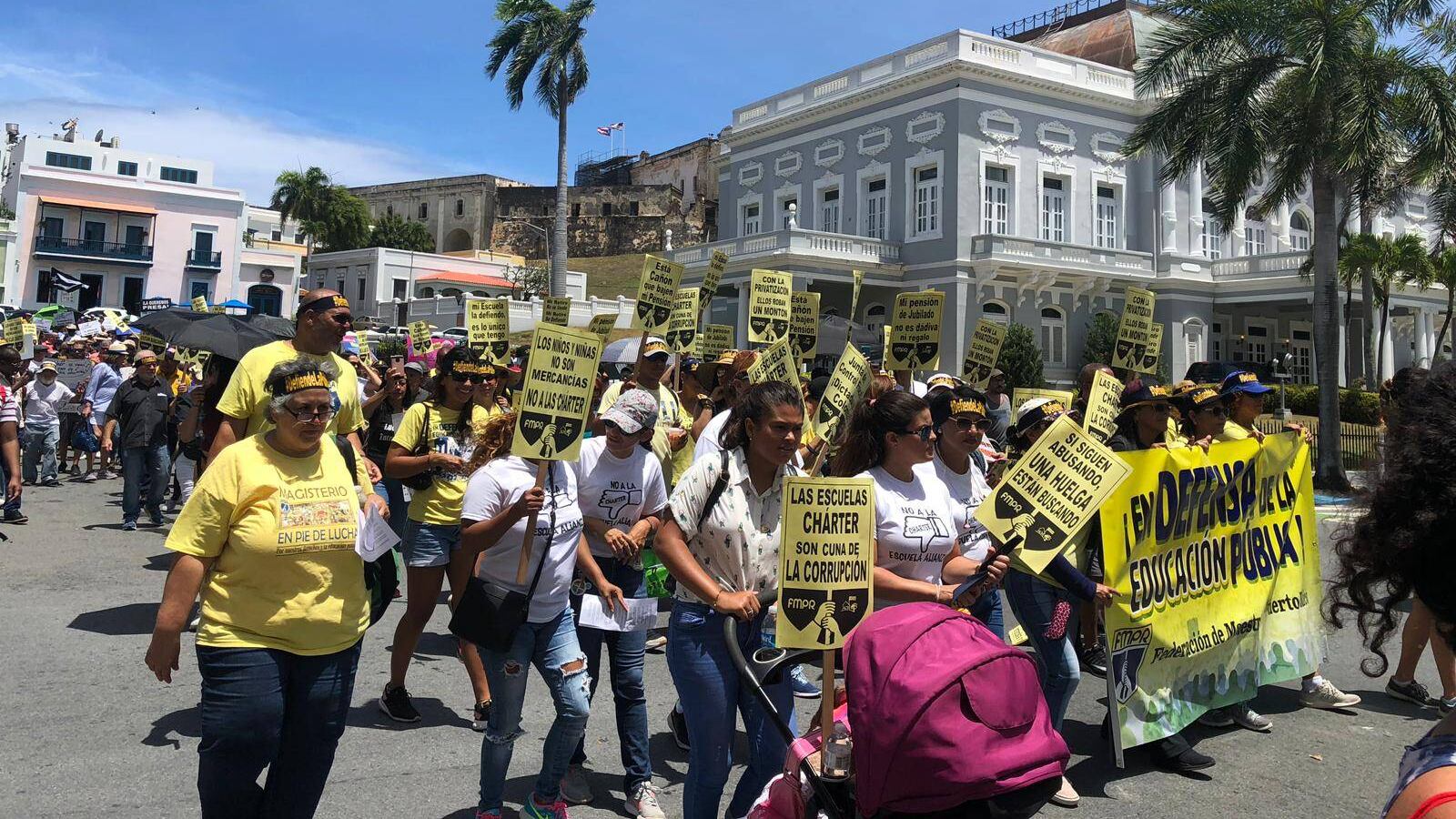 Docentes, estudiantes, padres y madres y jubilados marcharon hoy desde la Plaza Colón hasta La Fortaleza para reclamar que se derogue la Ley 85 de Reforma Educativa, así como consecuencias por investigación federal en contra de la exsecretaria de Educación, Julia Keleher.