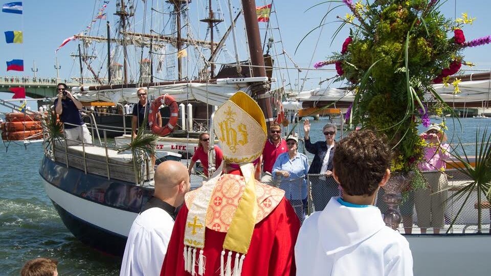 El obispo Felipe Estévez celebrará la misa a las 11:00 a.m. en la Catedral Basílica (38 Cathedral Place, San Agustín, Florida) y después de la misa, presidirá la tradicional Bendición de la Flota desde el Puente de los Leones.