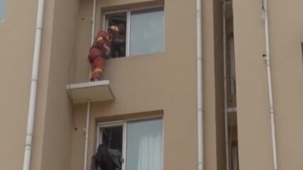Se colocó una cama de aire en el suelo en caso de que la niña se cayera, mientras que un bombero atado con una cuerda de seguridad bajó del cuarto piso y le dio una patada a la niña para que regresara a la casa.