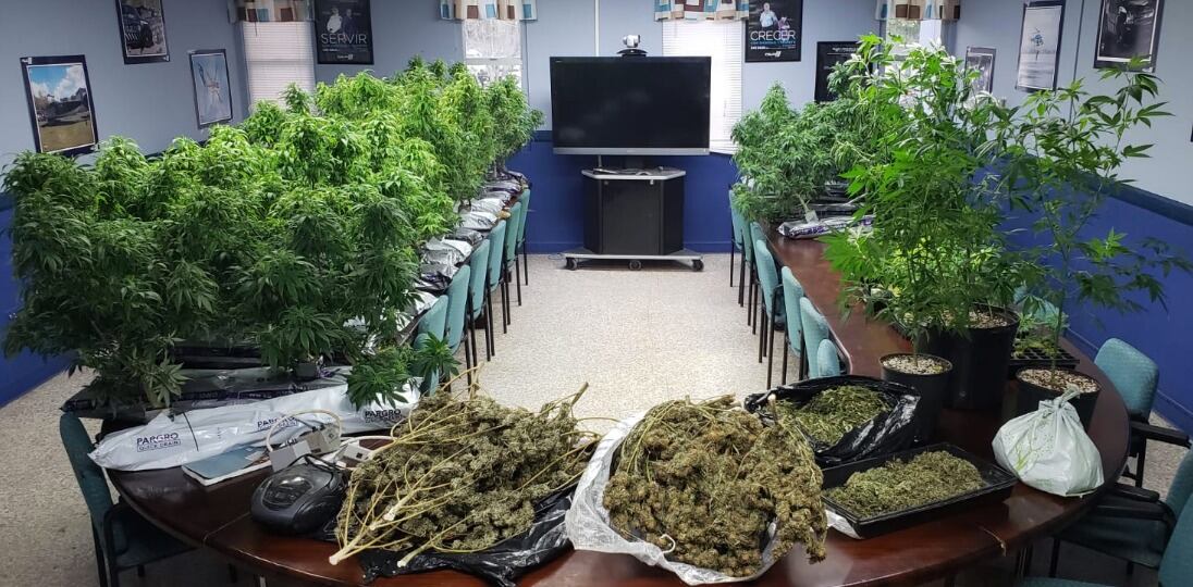 Según el parte policial, a eso del mediodía, agentes de las Divisiones de Vehículo Hurtados, División Droga, Patrulla Carretera, Unidad Motorizada y Comandancia, ocuparon una gran cantidad de matas de marihuana en una residencia abandonada que estaba como un invernadero, en el sector La Par del Barrio Dominguito.