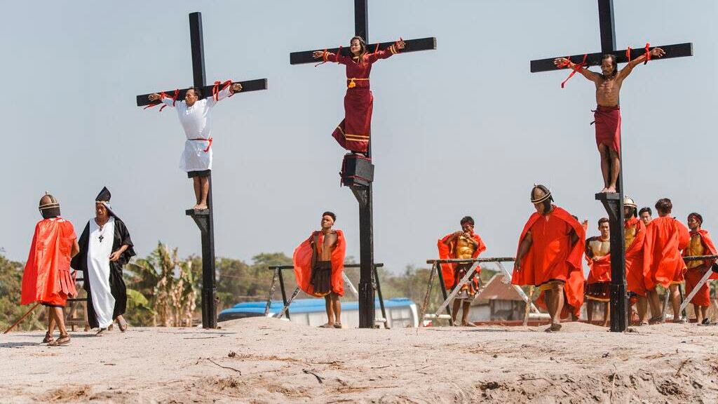 Cuatro hombres y una mujer, algunos de ellos con coronas de espinas, fueron escoltados por aldeanos vestidos como centuriones romanos antes de ser crucificados en las cruces colocadas sobre una polvorienta colina del pueblo San Pedro Cutud.