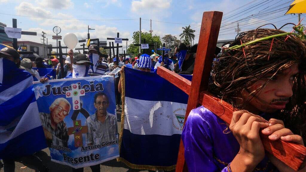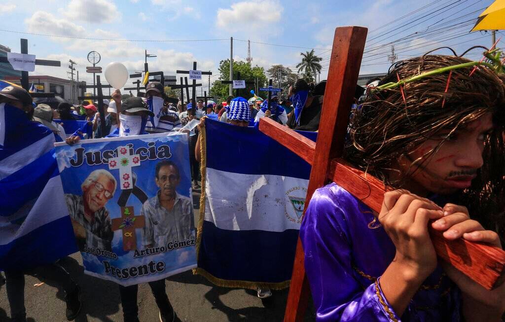 Mientras cientos de fieles caminaban en la tradicional procesión del Viacrucis hasta la catedral de la ciudad, docenas de manifestantes gritaban “justicia” y cargaban cruces de madera con los nombres de quienes fallecieron durante las movilizaciones del año pasado. Ondeaban la bandera nicaragüense, que se ha convertido en un símbolo de la oposición.