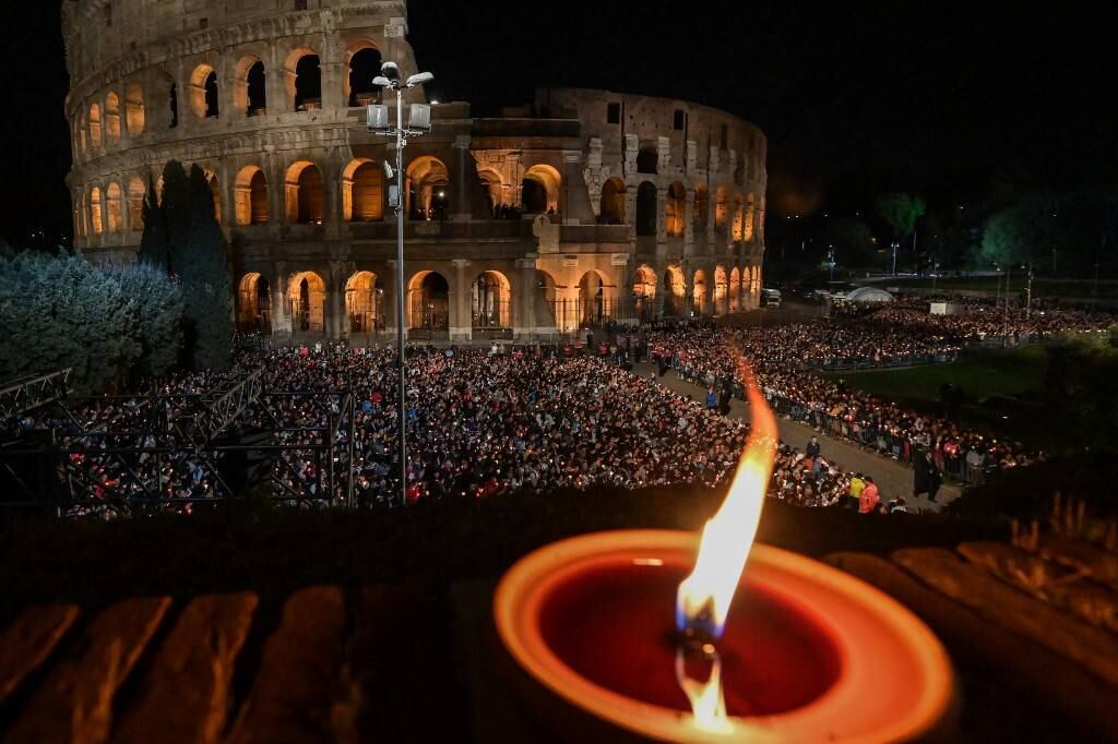 Alrededor del anfiteatro había unos 20.000 fieles que siguieron en silencio la ceremonia nocturna.