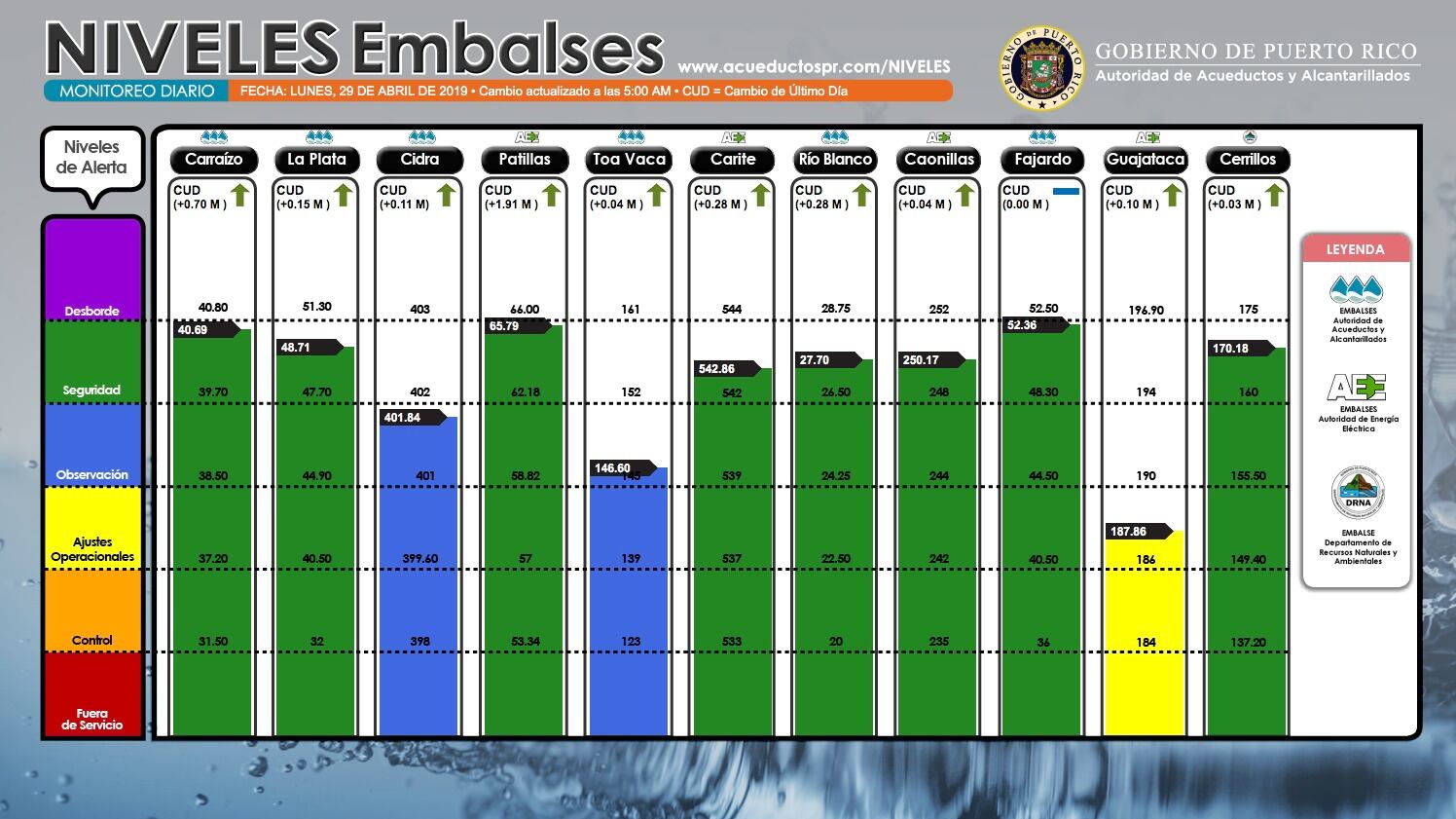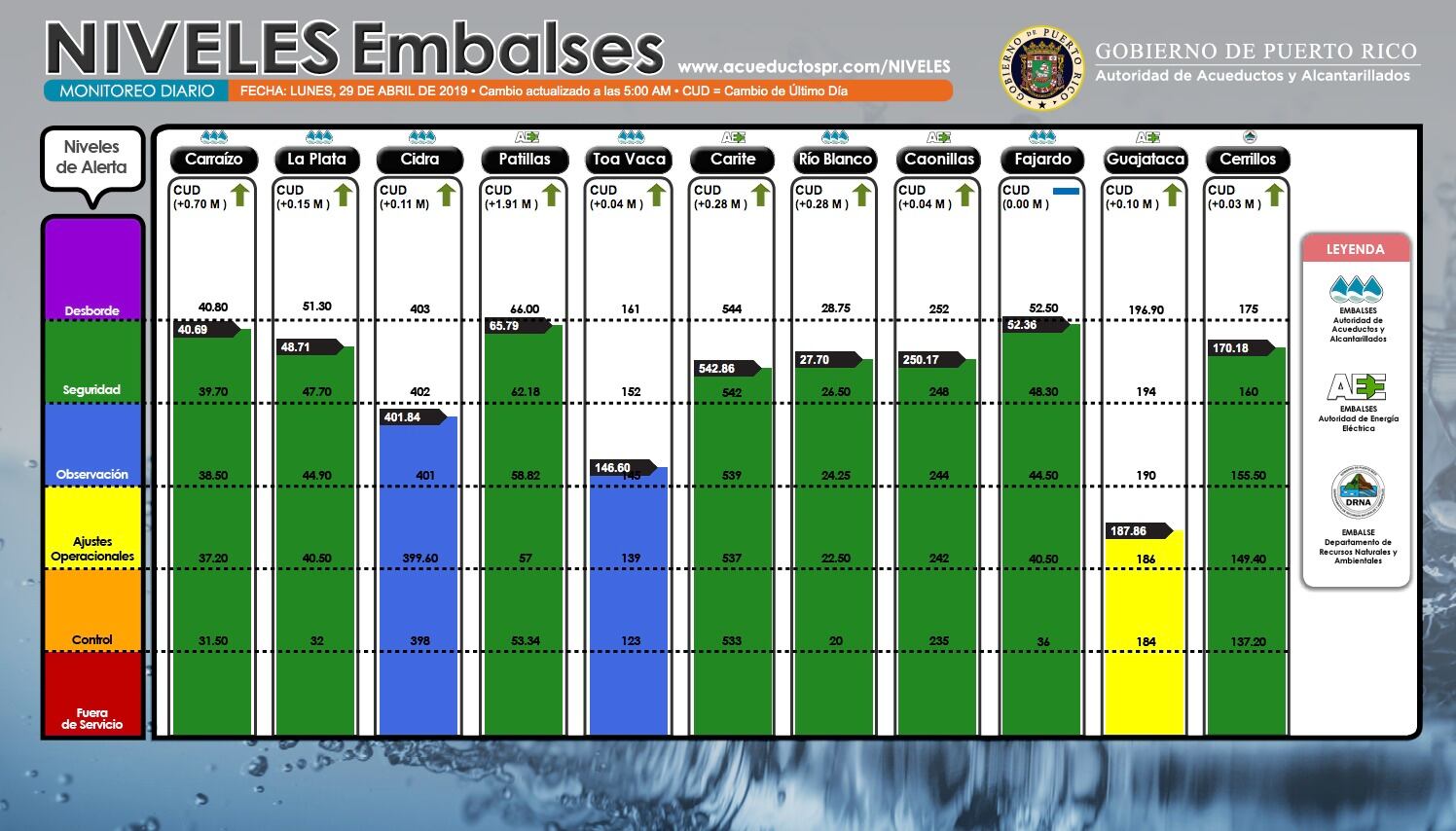 De acuerdo al monitoreo diario de la Autoridad de Acuediuctos y Alcantarillados, Guajataca, el más crítico, experimentó un aumento de 0.03 metros. Actualmente alcanza 187.86 metros, lo que lo ubica en nivel de “ajuste operacional”. Para superar esa fase, necesita llegar a 190.