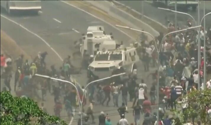 Manifestantes en favor de Juan Guaidó, presidente de la Asamblea Nacional y reconocido como presidente interino por más de 50 países, se enfrentaron con militares de la Guardia Nacional Bolivariana, quienes intentaron dispersarlos con chorros de agua y -en un momento- con el atropellamiento masivo usando una tanqueta.