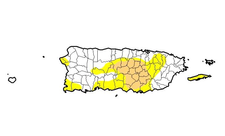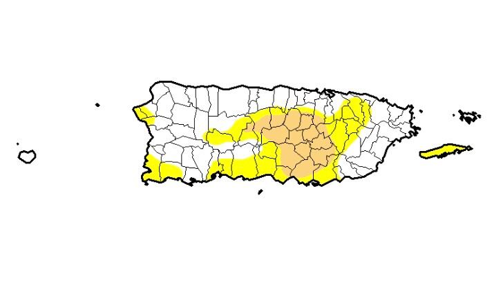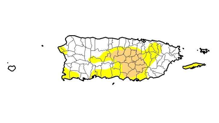 Según el último informe de la entidad federal, los municipios con partes o con la totalidad del terreno bajo el nivel de sequía moderada son: Jayuya, Ciales, Morovis, Corozal, Naranjito, Toa Alta, Bayamón, Aguas Buenas, Cidra, Caguas, Cayey, Guayama, Salinas, Aibonito, Coamo, Comerío, Barranquitas, Orocovis y Santa Isabel.