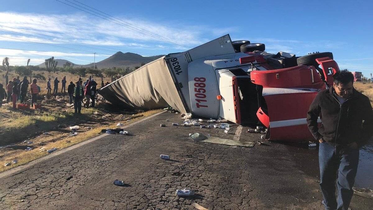 De nueva cuenta en Zacatecas, México, se registró un acto de rapiña luego que se volcara un tractocamión con doble remolque cargado de cerveza sobre la carretera federal 45, a la altura de la comunidad San José de Lourdes, en el municipio de Fresnillo.