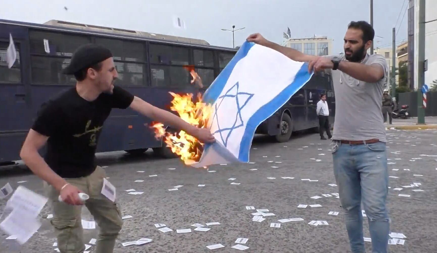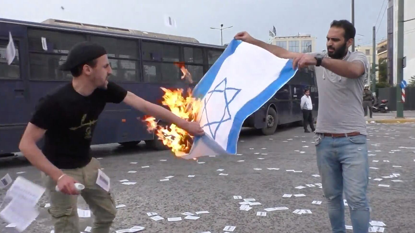 Los manifestantes se congregaron frente a la embajada israelí en el centro de Atenas, donde cantaron consignas alusivas “libertad” de Palestina, quemando banderas de Israel en presencia de fuerzas locales de la policía antidisturbios.