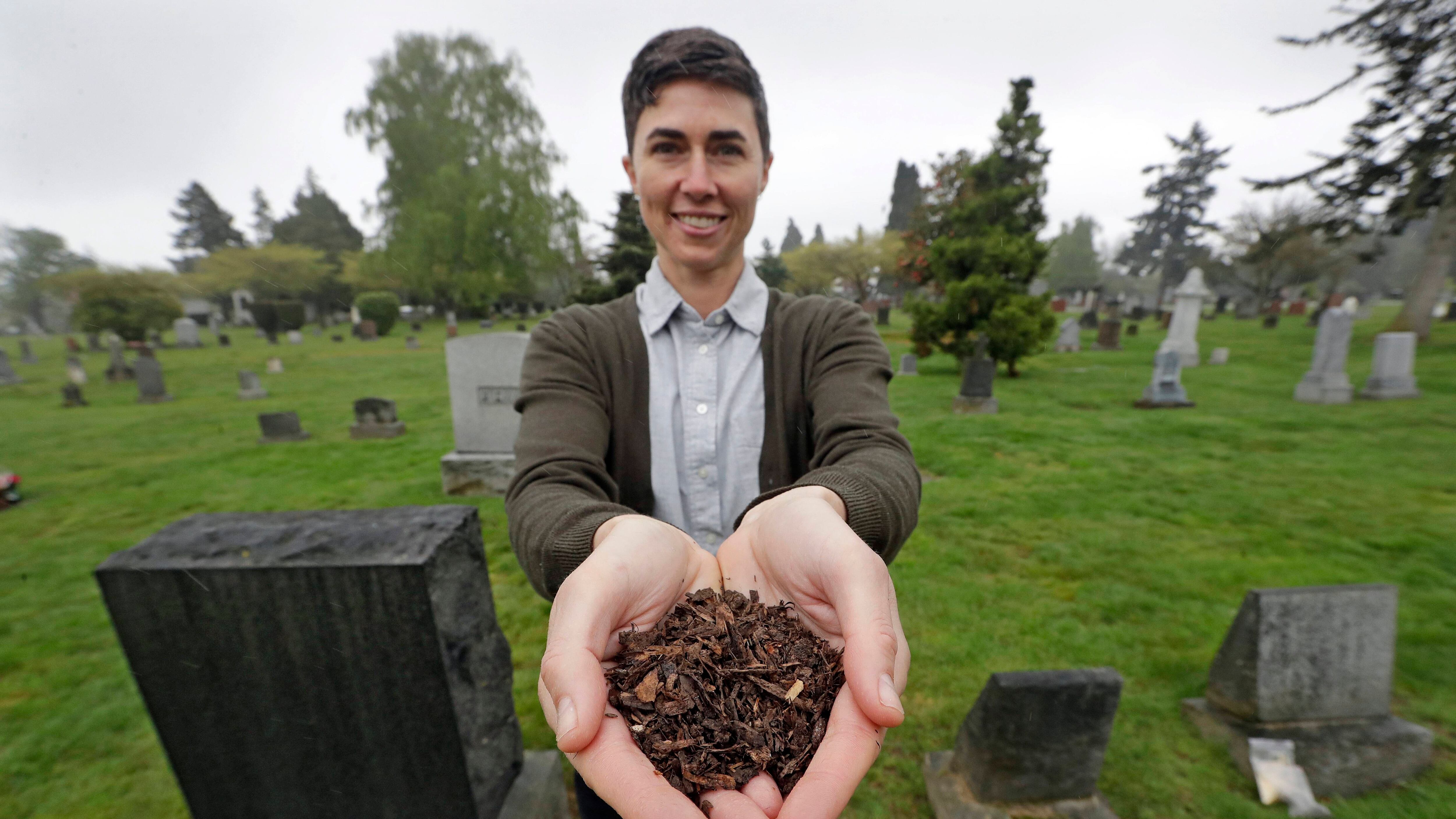 La ley permite que instalaciones certificadas ofrezcan “descomposición natural orgánica”, que mezcla restos humanos con residuos como trocitos de madera y paja, y los convierte en unas dos carretillas de abono en un lapso de varias semanas.