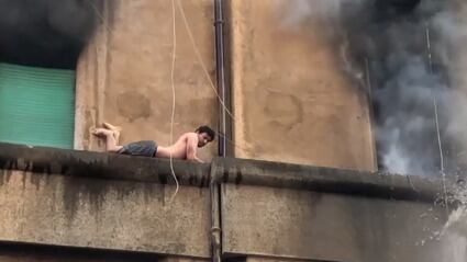 Bomberos de Roma rescataron este miércoles a un joven que se vio obligado a abandonar un apartamento en llamas y refugiarse en la cornisa del edificio.