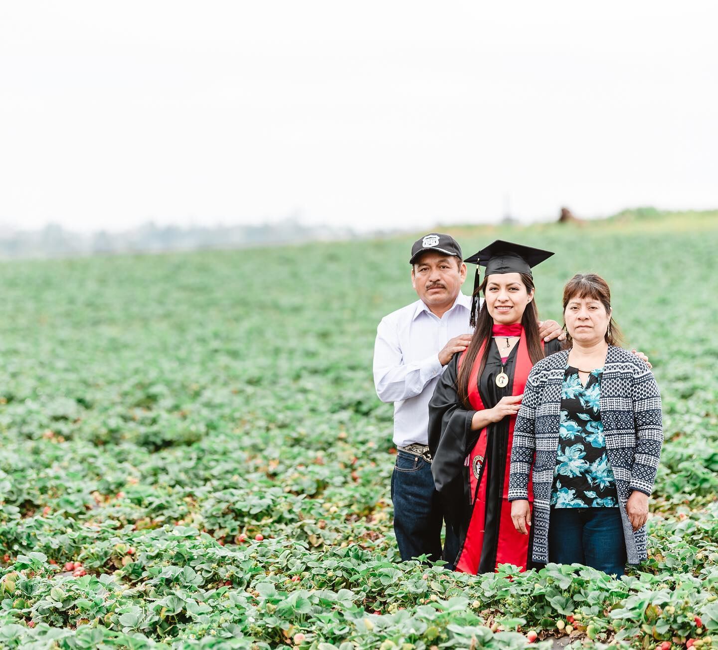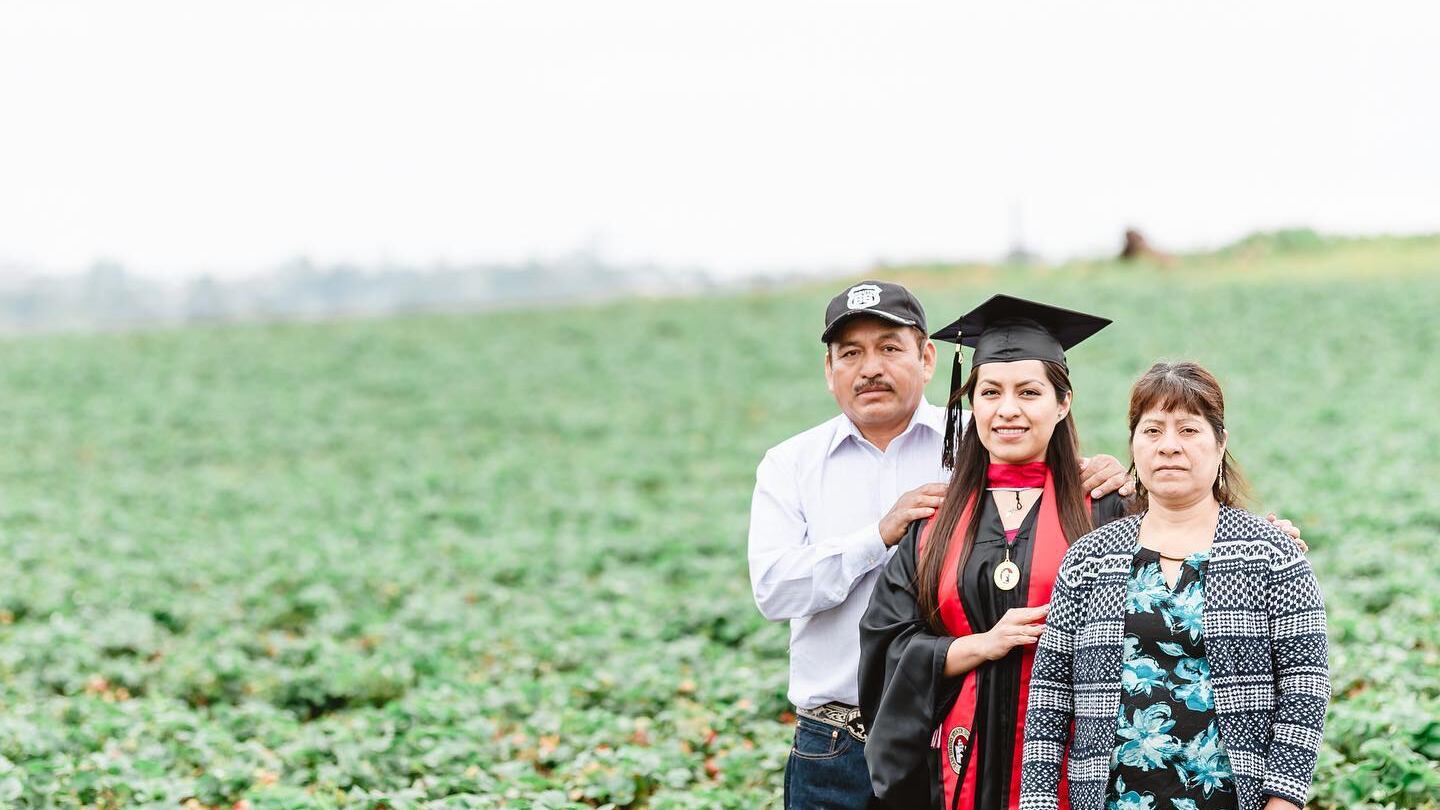 En sus fotos de graduación en los campos de Valle Central, Erica aparece juntos a sus padres, de pie con su toga y bata junto a ellos, quienes portan su ropa de trabajo.
