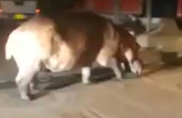 En una de las grabaciones, compartida en la página de Facebook del municipio, se puede ver al hipopótamo caminando por la carretera. También se observa como a las personas que lo persiguen para grabarlo. Escobar compró cuatro hipopótamos en los 80 y 90 para su zoológico privado.