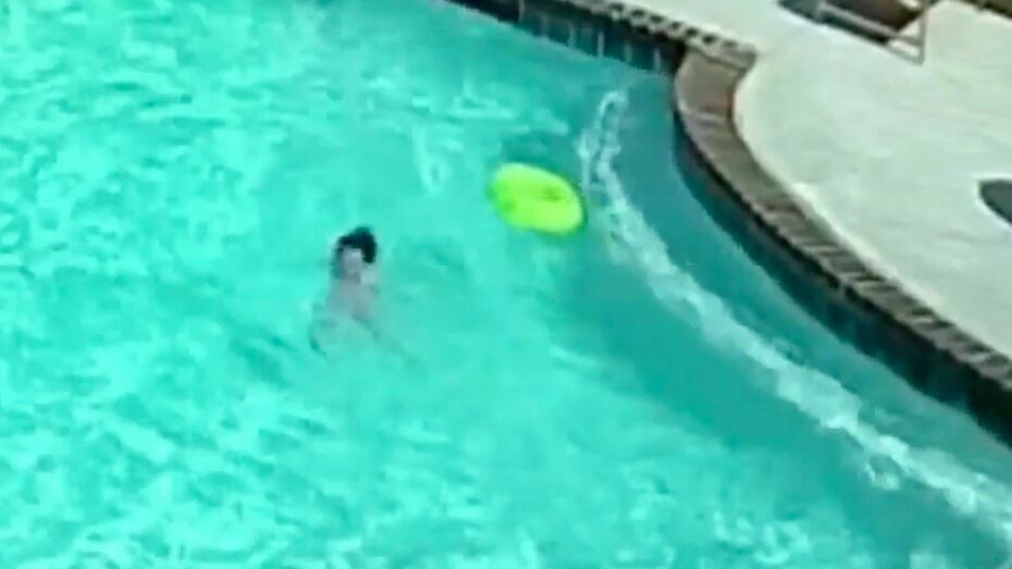 En el video de las cámaras de seguridad del complejo donde se encontraban las menores, se observa cuando la pequeña se lanza a la piscina en un flotador pero de inmediato se vuelca y comienza a ahogarse.