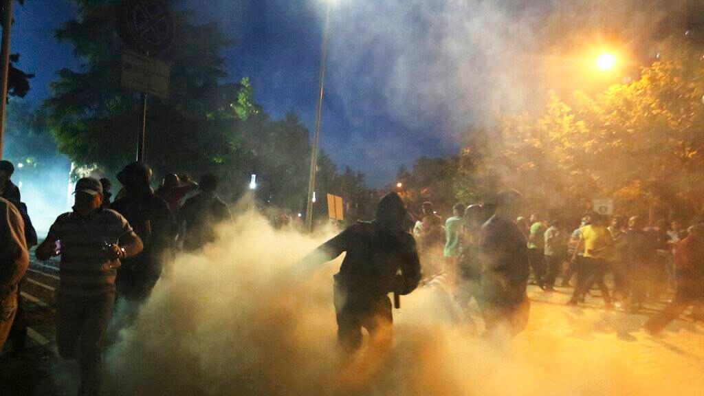 Al anochecer, gas lacrimógeno y humo cubrían las calles de Tirana. Algunos manifestantes lanzaron luces de bengalas, pirotecnia y bombas incendiarias contra los policías apostados afuera de la sede del Parlamento. La policía respondió con gas lacrimógeno y chorros de agua a presión.