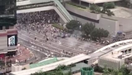 Este fue el momento en que los manifestantes en el área de Wan Chai en Hong Kong huyeron de un grupo de policías antidisturbios este 12 de junio durante el segundo día de manifestaciones contra un proyecto de ley de extradición.