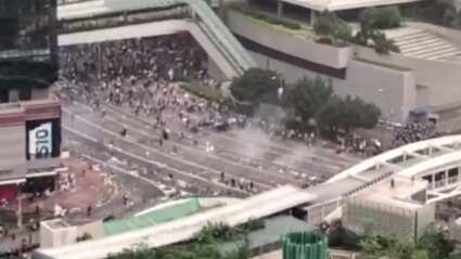 Las imágenes captadas en un edificio de gran altura en Queen’s Road E muestran nubes de gas lacrimógeno en el aire mientras los manifestantes huyen.