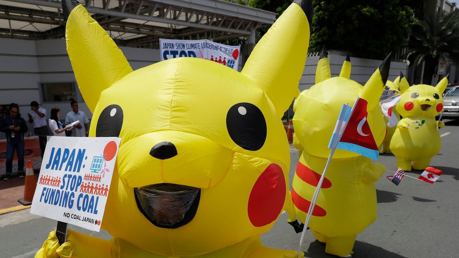 Activistas en la lucha por el cambio climático, vestidos como Pikachu, de la saga Pokémon, se manifestaron este martes en la embajada de Japón en Filipinas, exigiendo la financiación del país nipón -sede de la cumbre- al carbón.