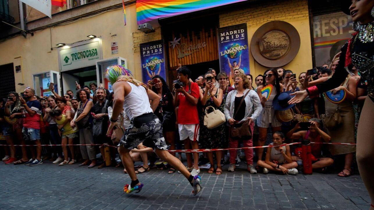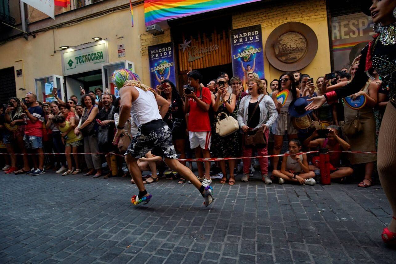 Una docena de hombres y algunas mujeres calzando unos pares de tacones “stiletto” corrieron a través del centro de Madrid, España, desafiando la gravedad, el calor y los atentados del partido Vox de coartar las celebraciones de orgullo gay de este año.