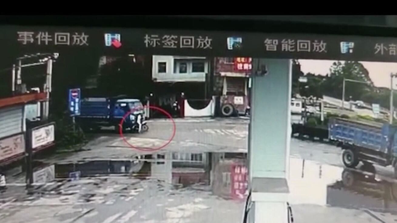 El video filmado por cámaras de seguridad en la ciudad de Xingning en la provincia de Guangdong el 5 de julio, muestra un camión que atropella a una chica en bicicleta antes de pasar encima ella. Como el conductor del camión no notó el incidente, se alejó sin detenerse.