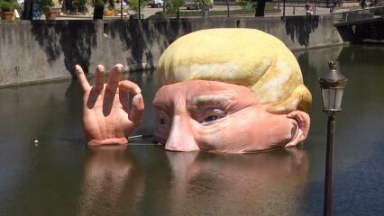 Una enorme instalación inflable que representa al presidente estadounidense Donal Trump hundido en el agua del río Mosela denuncia la política negacionista del cambio climático del mandatario, tal y como muestran las imágenes filmadas en miércoles en Metz.