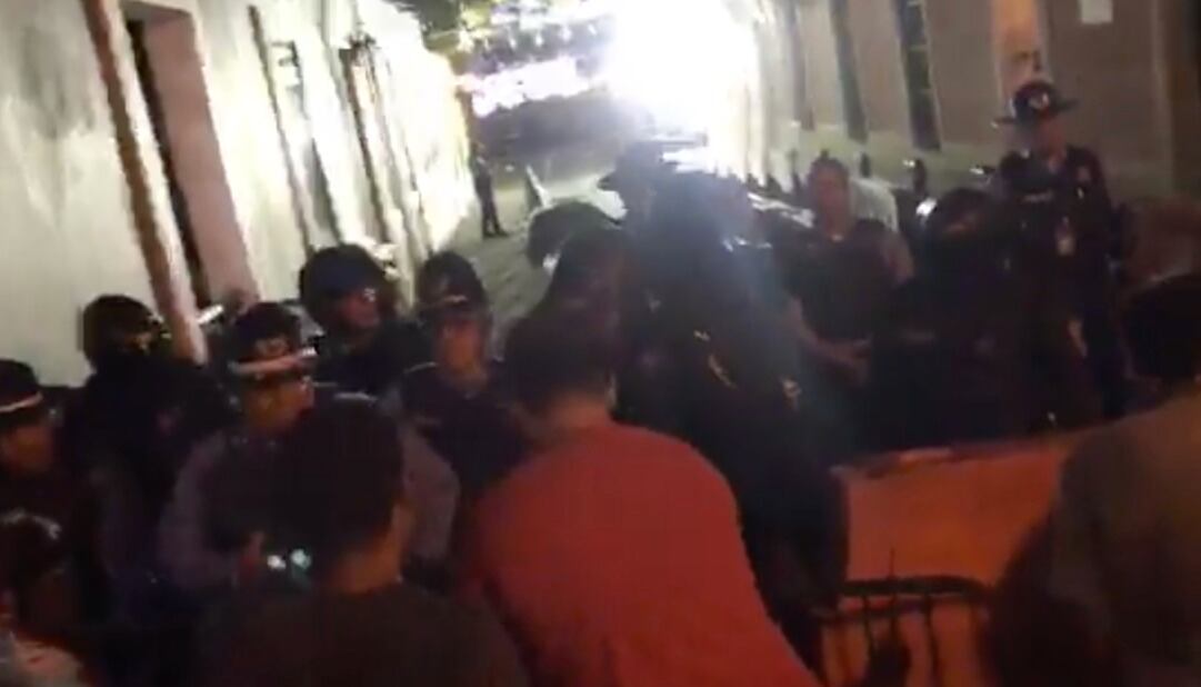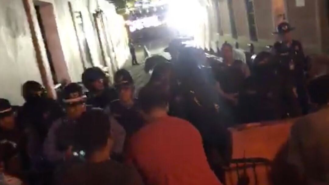 Policías estatales, por su parte, colocaron un candado a la entrada principal de la vivienda del gobernador y pidieron refuerzos ante la intensidad de las manifestaciones, mientras afuera manifestantes continuaban lanzando consignas.