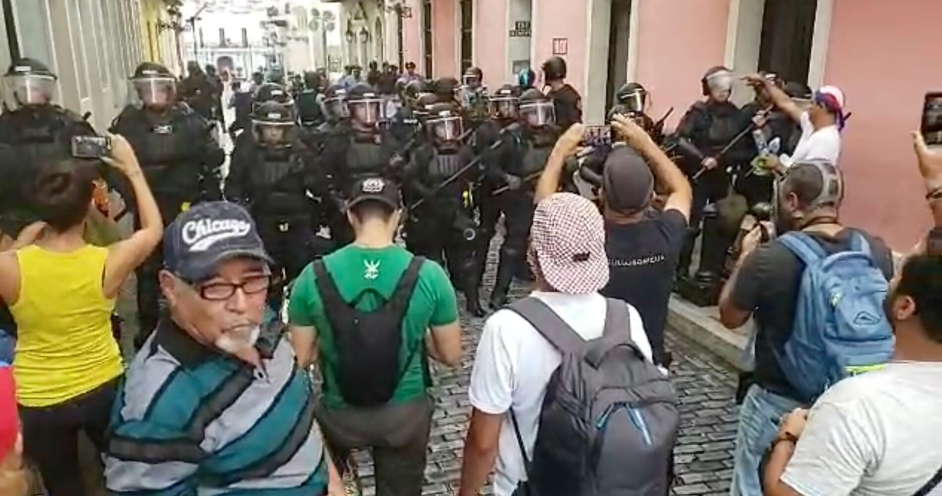 En medio de las protestas para que el gobernador Ricardo Rosselló renuncie a su cargo, los manifestantes en la Calle Fortaleza lograron volver a remover las vallas de seguridad que tenían agua y ahora se encuentran frente a frente con el perímetro impuesto por la Policía.