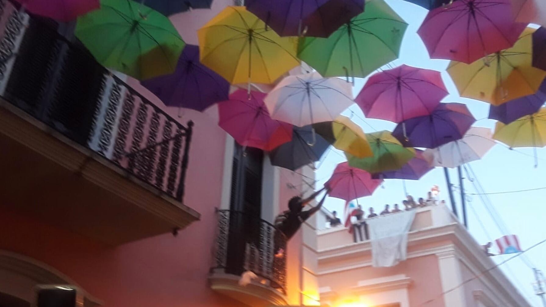 El paseo de las sombrillas de la calle Fortaleza, sufrió daños durante las manifestaciones que se llevaron a cabo en el día y noche de ayer por lo que esta mañana han comenzando a remover las mismas.