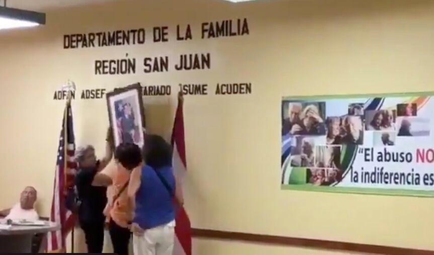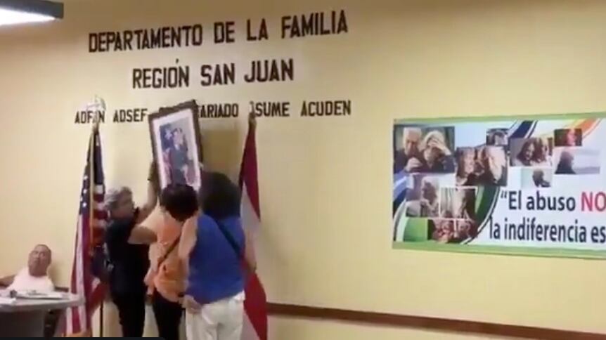 En protesta a los escándalos en la administración Rosselló, esta mañana se llevó a cabo el acto antes mencionado en una oficina del CESCO, y esta tarde se reportó la misma acción en una oficina del Departamento de la Familia donde unas féminas sacaron el retrato oficial del gobernador.