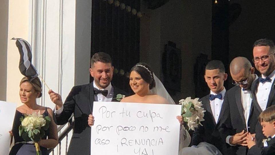 Con la bandera de resistencia puertorriqueña en mano, ramo de rosas y cartel en otra, una pareja de recién casados se manifestó en contra del gobernador, para exigir su renuncia, en plena boda celebrada en el Viejo San Juan.