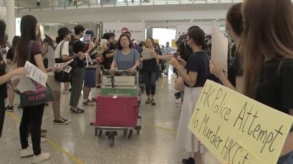 Las imágenes muestran a los manifestantes sentados en el suelo de la terminal, muchos de ellos sosteniendo pancartas y carteles mientras coreaban eslóganes contra el Gobierno de Hong Kong.