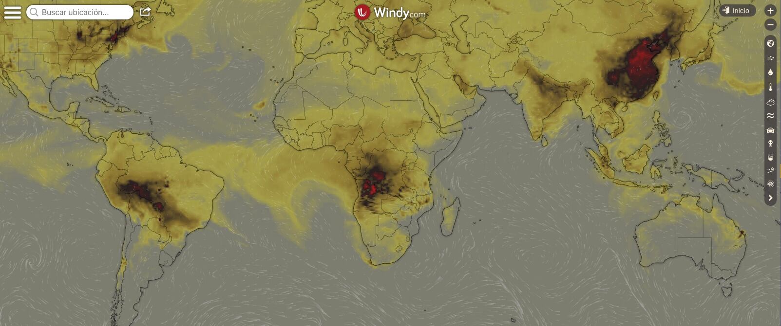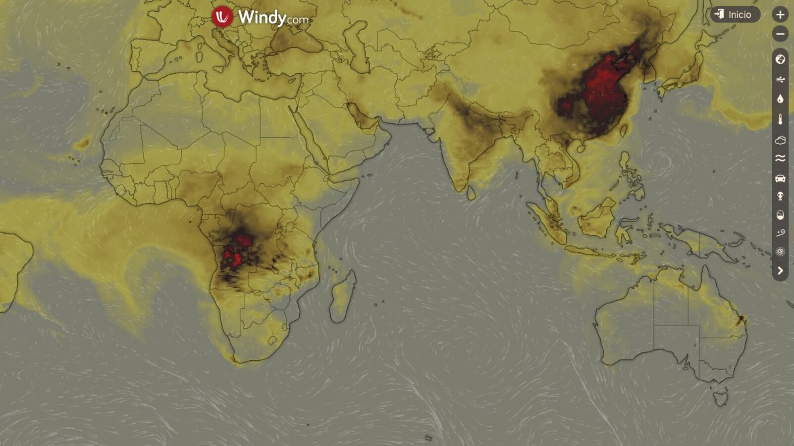 Así se ve en la imagen satelital de la plataforma Windy.com que muestra como las llamas destruyen enormes territorios también en China, Canarias, Bolivia, República Democrática del Congo, Angola, Alaska, Siberia y Rusia.