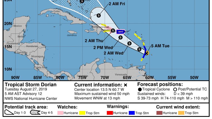 La tormenta tropical Dorian sigue su ruta hacia el oeste noroeste, mientras un aviso de tormenta tropical y una vigilancia de huracán se mantienen vigente para Puerto Rico.