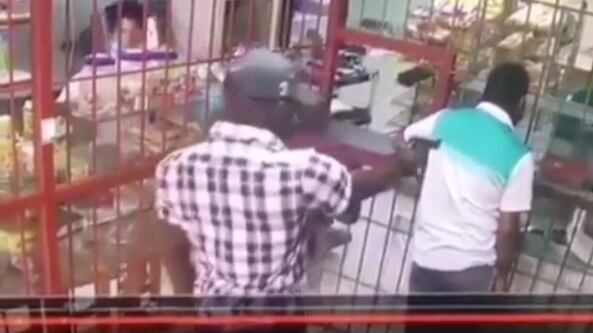 En la tienda se ve que un sicario entra a la tienda, pone la pistola en la espalda de un hombre, intenta disparar dos veces y no salen las balas.