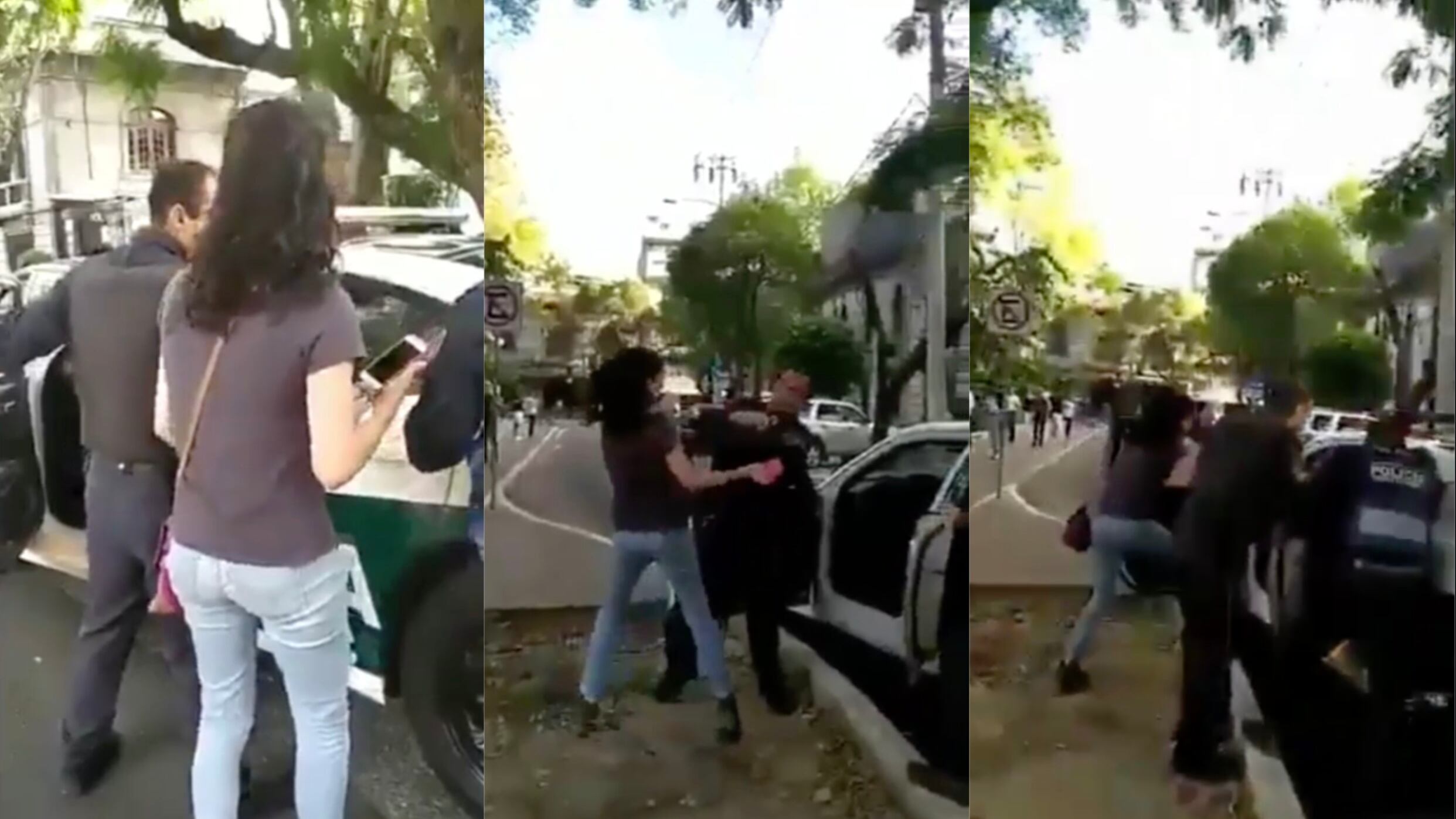 Sin embargo, lo hace nuevamente en el momento en que arranca la patrulla por lo que los policías la apartan; cuando tratan de acomodar al detenido que quería escaparse aprovechando la situación, la mujer intenta conducir la patrulla así que el uniformado la saca con fuerza de la unidad, lo que provocó la furia de la mujer quien se soltó a darle golpes en la cara al policía.