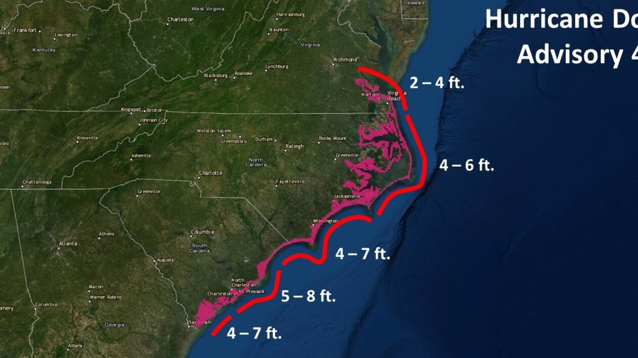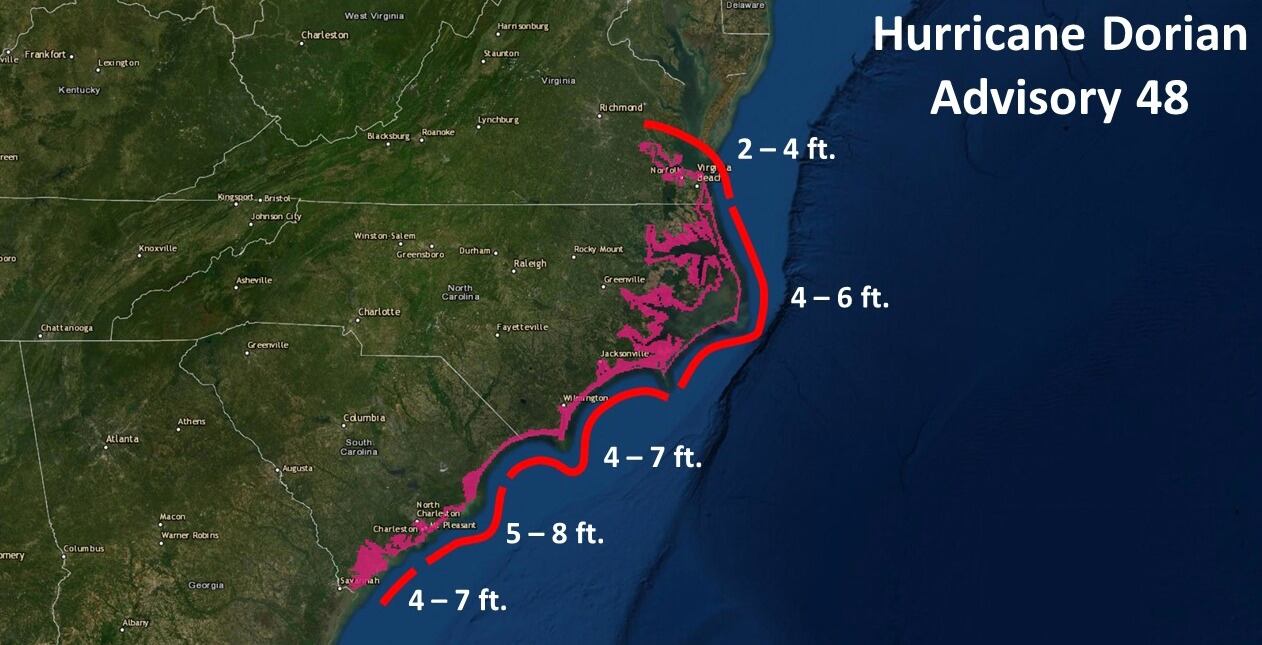 Aunque más débil, Dorian seguía siendo una fuerza a tener en cuenta. El ojo de la tormenta, visible en las fotos desde el espacio, estaba a las 5 de la madrugada unos 130 kilómetros (80 millas) al sur-suroeste de Charleston y avanzaba hacia el norte a 13 kilómetros (8 millas) por hora sobre el mar, con peligrosos vientos de 185 kilómetros (115 millas) por hora.