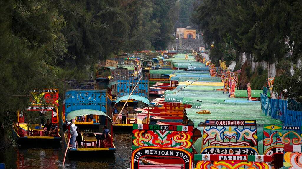 Decenas de embarcaciones de vivos colores llamadas “trajineras” —entre cuyos nombres figuran “Victoria” y “Yolanda”— permanecían inmóviles, amarradas unas a otras con gruesas cuerdas en el muelle Nativitas, en los famosos canales de Xochimilco en Ciudad de México.