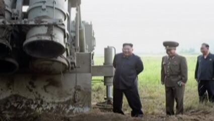 Según las imágenes publicadas por los medios estatales de Corea del Norte (NKTV), Kim supervisó el lanzamiento de dos cohetes en el lugar no especificado.