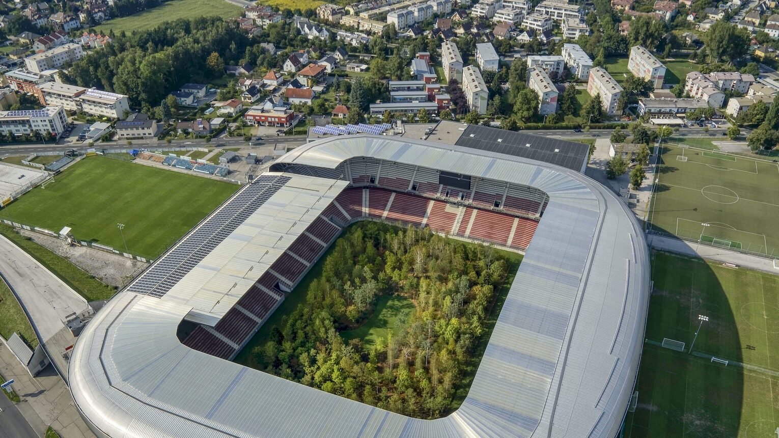 Probablemente nunca imaginaste ver un pequeño bosque dentro de un estadio de fútbol. El artista y arquitecto austríaco Max Peintner lo plasmó en un dibujo que inspiró al curador suizo Klaus Littmann a convertirlo en realidad transformando el estadio de fútbol de Wörthersee en Austria en un bosque nativo de Europa Central, como parte del proyecto FOREST, recientemente abierto al público. MWN