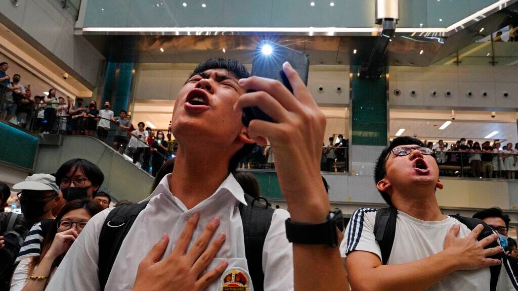 En el New Town Plaza del distrito de Sha Tin, unas 2.000 personas repartidas por varias plantas corearon lemas reivindicativos antes de empezar a cantar en una emotiva escena, en la que algunos lloraban y muchos levantaban las manos. Muchos leían la letra en sus celulares mientras cantaban a cappella.